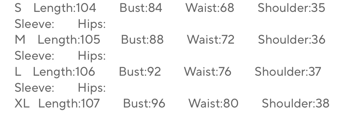 Size chart in cm